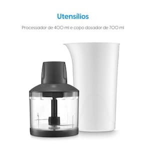 O corpo desmontável facilita o encaixe dos acessórios e a limpeza do aparelho, tornando o processo mais prático. Além disso, o mixer acompanha um copo dosador, auxiliando no preparo e na medida exata dos ingredientes, fouet para bater ovos e massas leves, e processador para 400mL.