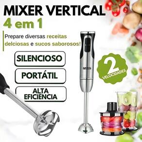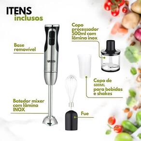 Mixer 4 em 1 com lâminas em inox, motor de 500W, corpo removível para fácil limpeza, inclui base de processador, ponta mixer e ponta fue batedor.Acompanha copo