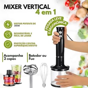 Motor de 300W, lâminas em inox, corpo removível, proteção contra superaquecimento.Acompanha copo