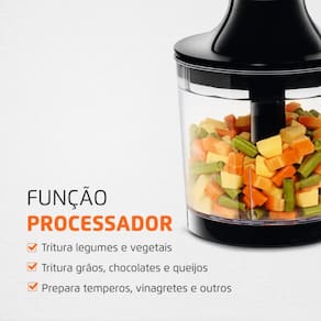 2 EM 1: Eficiente e versátil, o aparelho funciona como mixer e processador de alimentos. Permite preparar sopas e caldos, sucos e vitaminas, triturar legumes e vegetais, grãos e temperos.