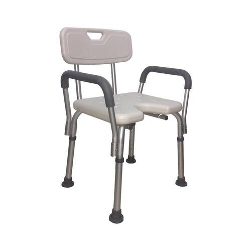 Descrição técnica:Confeccionada em alumínioFixada por parafusosCom encosto em Polietileno de Alta densidadeAssento Anti derrapanteAbertura frontal para HigienizaçãoPonteira Anti DerrapanteRegulagem de altura em 8 posiçõesCapacidade de Peso: 110kgsAltura de assento: 35cm a 52cmMedidas do assento: 41 cm de largura e 34 cm de profundidadeMedidas gerais da cadeira: 72 x 53 x 42 cmOBS: a cadeira vem desmontada com manual
