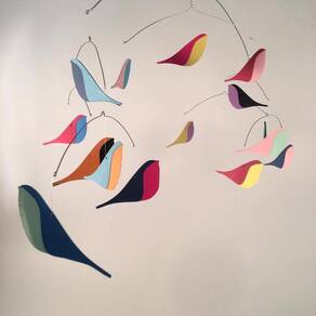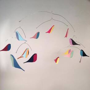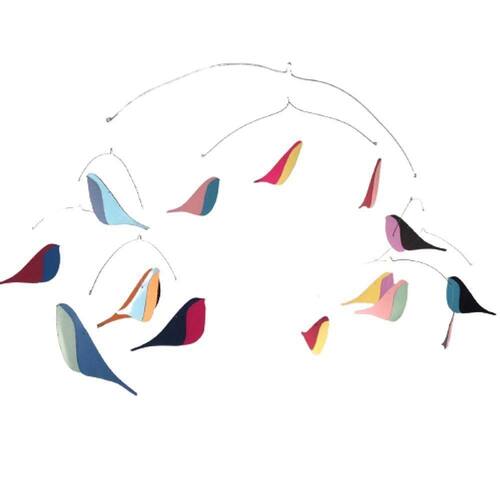 Móbile Berço Bebê Infantil Quarto Passarinhos Coloridos Aquarela de passarinhos, Mobile cinético. Do grego "knesis" que significa "Movimento". Uma forma de arte contemporânea que tem movimento constante. No quarto do bebê, perto do berço vai entretê-lo e acalma-lo, enquanto decora alegremente. - 70cm de largura x 50 de altura - 15 passarinhos bicolores de papel alta gramatura - Arame central de aço galvanizado e demais aros em aço inox. - Fio de nylon de 1 metro para pendurar Ean: 7894476318928