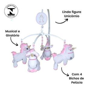 Mobile para Berço de Bebês Musical e GiratórioUnicórnio O móbile para berço é um item muito importante na decoração, bastante gracioso, meigo e lúdico O movimento das peças vai entreter o bebê dentro do bercinho, ideal para embalar o sono do neném O móbile para berço musical é ótimo para estimular audição e visão do bebê. Não é a toa que eles são pendurados acima do seu amor. Especialistas dizem que os móbiles ainda estimulam o senso de direção e lateralidade, fazendo com que a criança acompanhe o objeto de um lado para o outro. Pensando em todos os benefícios para o bebê, nós da Erich Baby fazemos a montagem do móbile diferenciada, onde a montagem é feita com os ursinhos olhando para baixo, para o bebê visualizar o ursinho por completo e estimula-lo mais. Certificado: ------------------------- Todos os nossos produtos passaram pelo rigoroso teste do Inmetro sendo aprovados e certificados. No Brasil é obrigatório o selo do Inmetro em qualquer produto destinado a crianças, não brinque com a segurança do seu bebê, não compre produtos que não foram testados e aprovados pelo Inmetro. Personalização: ------------------------- Basta informar o nome do bebê, informando o nome por mensagem no ato da compra. Caso não envie o nome, o móbile será enviado sem personalização, apenas com desenho. Conteúdo: ----------------------- -Mobile musical e giratório com 4 bichinhos de pelúcia com macacão e gorrinho - Acompanha 1 suporte para fixar no berço e caixa de música à corda sem necessidade de uso de pilha. Contém a trava de interrupção, a canção dura em média de 2 a 3 minutos. Cores e estampas podem ser alteradas segundo nosso . Medidas: --------------- - 4 ursinhos de pelúcia 1 cm - 1 pingente central - suporte móbile: Altura: 55.00 cm Largura: 35.00 cm Comprimento: 45.00 cm Peso: 360 gramas Modo de montar: --------------------------- O suporte se encaixa em qualquer Berço desmontável, Chiqueirinho e Berço Americano. Basta encaixar as peças e rosquear no berço que o móbile estará preso. DADOS TÉCNICOS: ------------------------------ FABRICAÇÃO NACIONAL Pelúcias antialérgicas Peças são presas com fio de nylon altamente resistente. A estrutura do móbile é feita em plástico não tóxico e pode ser fixada no berço, chiqueirinho, ou qualquer plataforma através de rosca ajustável. Possui sistema giratório movido à corda, não utiliza pilhas. O tempo da música pode variar entre 1:30 e 2:00 minutos. A montagem é fácil e segura, atarraxar com firmeza na lateral do berço ou chiqueirinho do bebê. Possui uma doce melodia para acalmar seu bebê, tão doce quanto uma canção de ninar da mamãe. Ideal para decorar o quartinho do bebê. Limpeza: --------------- Basta limpar com pano