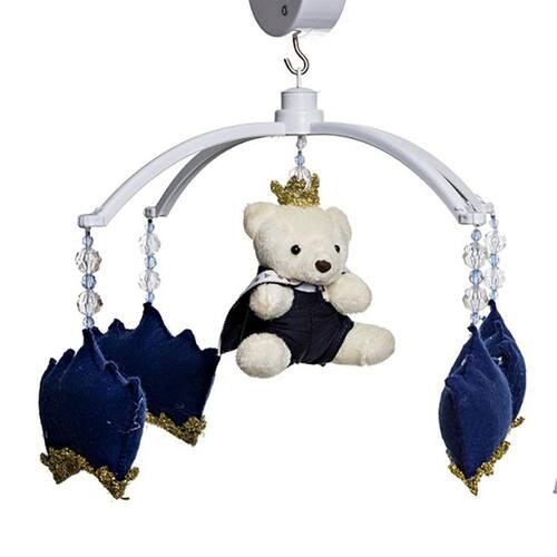Dados Técnicos Móbile musical com estrutura em plástico decorado com ursinho príncipe e corôas de feltro presos com cordão encerado altamente resistente. Algumas peças da decoração central pode ter variações de acordo com a disponibilidade no momento.