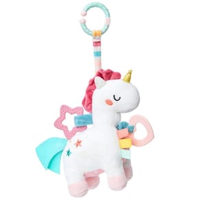 Possui mordedores com diferentes texturas, elementos com sons de chocalho e uma suave melodia ativada por uma cordinha, que acalma e entretém o bebê.