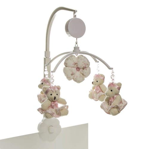 Dados Técnicos Móbile musical com estrutura em plástico decorado com ursinhas de pelúcia e florzinha de tecido presas com cordão encerado altamente resistente. Algumas peças da decoração central pode ter variações de acordo com a disponibilidade no momento.