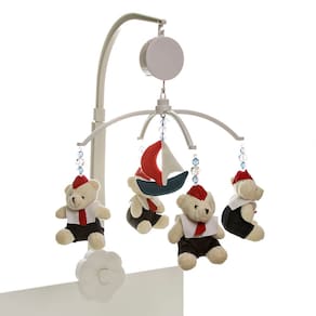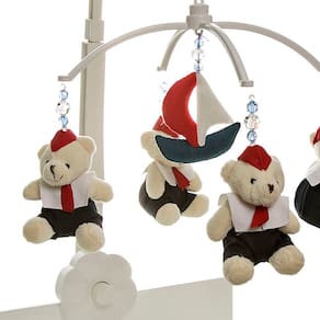 Dados Técnicos Móbile musical com estrutura em plástico decorado com ursinhos marinheiros e barquinho de feltro presos com cordão encerado altamente resistente. Algumas peças da decoração central pode ter variações de acordo com a disponibilidade no momento.