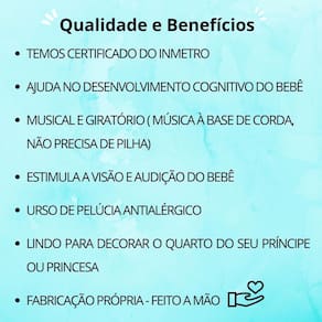Conteúdo: -mobile Musical e Giratório com 5 bichinhos de pelúcia - Acompanha 1 suporte para fixar no berço e caixa de música à corda sem necessidade de uso de pilha. Contém a trava de interrupção, a canção dura em média de 2 a 3 minutos.