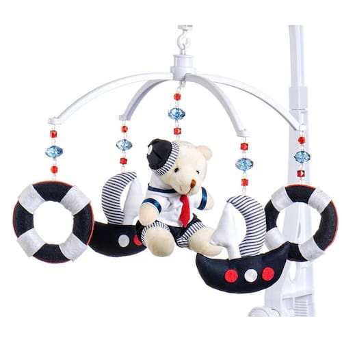 O Móbile para berço musical e giratório Urso Marinheiro é o acessório ideal para dar o toque final na decoração do quarto do bebê. Possui uma doce melodia para acalma-lo, tão doce quanto uma canção de ninar da mamãe. Além disso, o móbile é giratório buscando estimular a interação da criança com o objeto.Características:- Produto de Fabricação Nacional- Pelúcias antialérgicas- Peças são presas com cordão encerado altamente resistente.- A estrutura em plástico não tóxico pode ser fixada no berço, chiqueirinho, ou qualquer plataforma através de rosca ajustável.- Possui sistema giratório movido à corda. não utiliza pilhas.- O tempo da música pode variar entre 1:30 e 2:00 minutos.- A montagem é fácil e segura, atarraxar com firmeza na lateral do berço ou chiqueirinho do bebê.Especificações Técnicas:- Dimensões do produto C x L x A : 40cm x 30cm x 45cm- Material: Plástico- Cor: Azul- Modelo: Urso Marinheiro- Marca: Sleepbaby Móbiles- Certificação: INMETRO CEBRI/BRICS0056717Observação: Todos os nossos produtos passaram pelo rigoroso teste do Inmetro sendo aprovados e certificados.No Brasil é obrigatório o selo do Inmetro em qualquer produto destinado a crianças. não brinque com a segurança do seu bebê. Não compre produtos que não foram testados e aprovados pelo Inmetro. Marca: Sleepbaby Móbiles