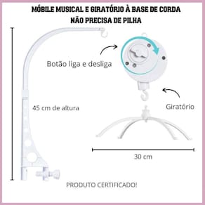 Conteúdo: - Mobile musical e giratório com 4 bichos de pelúcia - Acompanha 1 suporte para fixar no berço e caixa de música à corda sem necessidade de uso de pilha. Contém a trava de interrupção, a canção dura em média de 2 a 3 minutos.
