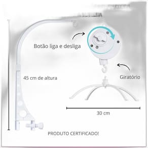 Mobile para Berço Bebê Musical Ursa Princesa Rosé MARCA: ERICH BABY Produto Certificado pelo Inmetro CE-BRI/IQB - 6437 NM 300/2002 Segurança do brinquedo O móbile é um item muito importante na decoração, bastante gracioso, meigo e lúdico Seu movimento vai entreter o bebê dentro do bercinho, ideal para embalar o sono do neném Os móbiles musicais são ótimos para estimular audição e visão do bebê. Não é a toa que eles são pendurados acima do seu amor. Especialistas dizem que os móbiles ainda estimulam o senso de direção e lateralidade, fazendo com que a criança acompanhe o objeto de um lado para o outro. Pensando em todos os benefícios para o bebê, a montagem do móbile é feita com os ursinhos olhando para baixo, para o bebê visualizar o ursinho por completo e estimula-lo ainda mais. Conteúdo: - Mobile musical e giratório com 4 bichos de pelúcia - Acompanha 1 suporte para fixar no berço e caixa de música à corda sem necessidade de uso de pilha. Contém a trava de interrupção, a canção dura em média de 2 a 3 minutos. Cores e estampas podem ser alteradas segundo nosso . Medidas: - Bichinho de pelúcia 9 cm - Suporte móbile: Altura: 55.00 cm Largura: 35.00 cm Comprimento: 45.00 cm Peso: 360 gramas Modo de montar: O suporte se encaixa em qualquer Berço desmontável, Chiqueirinho, Carrinho e Berço Americano. Basta encaixar as peças e rosquear no berço que o móbile estará preso. Limpeza: Basta limpar com pano úmido. Embalagem: Largura 22,00 cm Altura 8,00cm Comprimento 31,00 cm Peso 500,00 g Marca: Não Informado