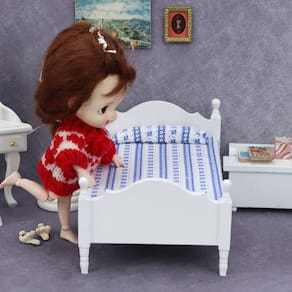 Dimensões: Comprimento 17 cm x largura 10,1 cm x altura 8,4 cm Material: madeira Peso: 160 g Design encantador: cama de solteiro branca em miniatura com colchão macio com capa estampada e travesseiro, perfeita para configurações de quartos de casas de bonecas. Durável e realista: feito de madeira de alta qualidade com bordas lisas e artesanato detalhado, adicionando uma sensação aconchegante e realista a qualquer casa em miniatura. Escala ideal: projetada para casas de bonecas em escala 1:12, esta cama tem o tamanho perfeito para decoração de quartos, teatros e coleções domésticas em miniatura. Nota de segurança: Brinquedo não infantil — evite riscos de asfixia para crianças pequenas. Este produto é apenas um modelo de brinquedo e não se destina ao uso na vida real. Brincadeira criativa: ideal para fingir, contar histórias e enriquecer a imaginação das crianças, ao mesmo tempo em que aprimora sua coleção de móveis para casas de bonecas.