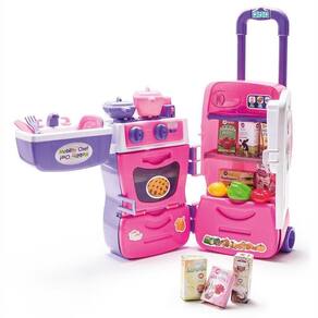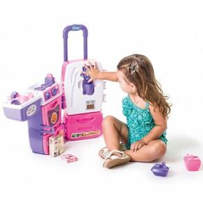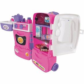 Uma cozinha completa em um só brinquedo. Esta super maleta se transforma em uma cozinha completa! Tem fogão, forninho, pia, gavetas, torradeira e uma geladeira com filtro de água na porta que sai água de verdade! A brincadeira fica completa com panelinhas, pratinhos e talheres e frutas, e caixinhas. A Mobility Chef tem alça retrátil e rodinhas para sua super chef levar a brincadeira onde quiser.