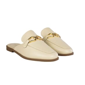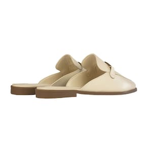 O modelo tem salto rasteiro e bico redondo. Fechada, traz recorte lateral na gáspea e aplicação de bridão metálico sobre o cabedal. Deixa o calcanhar à mostra.