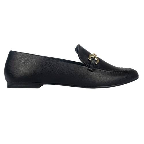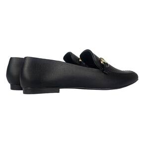 Mocassim loafer feminino, confeccionado em material sintético, bridão decorativo no cabedal e bico redondo com costura reforçada.