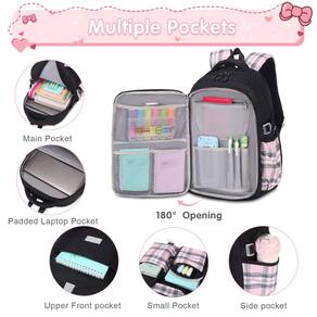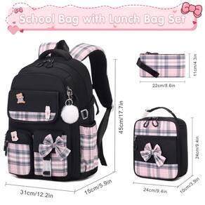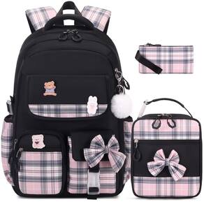 Mochila para meninas – Mochila escolar para meninas e crianças - ?Conjunto de mochila para meninas atualizado?Receba nosso conjunto de mochila escolar atualizado, completo com lancheira isolada e um adorável estojo, garantindo que seu filho esteja totalmente equipado para a escola com conveniência. Nossa linda bolsa de livros também junto com crachá de personalidade (em um pequeno bolso frontal com zíper) como presente torna as bolsas mais elegantes e exclusivas. Eleve o estilo escolar do seu filho com este acessório essencial – porque eles merecem o melhor! - ?Mochila com vários compartimentos?A mochila para meninas tem bolso frontal grande de abertura de 180 graus. O bolso principal inclui capa acolchoada para laptop com cinto elástico e bolsos internos ocultos. Os bolsos frontais para ferramentas também vêm com vários compartimentos, os três bolsos frontais podem guardar itens essenciais e outros itens pequenos para sua organização diária. A mochila prática para meninas com vários bolsos ajudará as crianças a encontrar o que querem rapidamente. - ?Única e bem projetada?As mochilas para meninas medem 45 cm (A) x 31 cm (C) x 5,9 (L) e a lancheira mede: 23,9 cm (A) x 21,8 cm (C) x 3,9 cm (W), o estojo: 11 cm (A) x 21,8 cm (C). Nossa bolsa de livros é uma combinação de laço e xadrez, cumpre o sonho de princesa da menina! Seja para escola, acampamento, viagens, caminhadas ou outras atividades ao ar livre, esta mochila é versátil e elegante. - ?Impermeável e dural?Nossa mochila infantil é feita de tecido de nylon de alta densidade à prova d'água, ultraleve, inodoro, e forro de poliéster. Ela pode proteger todos os itens da mochila de garoas e de limpar. As alças largas e espessas duráveis em forma de S são bem acolchoadas, ajustáveis e confortáveis de transportar. Acabamento de alta qualidade e zíperes suaves proporcionarão a você o máximo prazer na escola. - ?Presente perfeito para meninas?Nossa mochila infantil não é apenas uma bolsa; é um acessório divertido e divertido, tornando-a uma escolha popular entre as meninas. Ideal para meninas do jardim de infância, ensino fundamental e médio. Também é o presente perfeito para a volta às aulas, formatura, Ação de Graças, Natal, aniversários ou qualquer ocasião especial para crianças e seus amigos.
