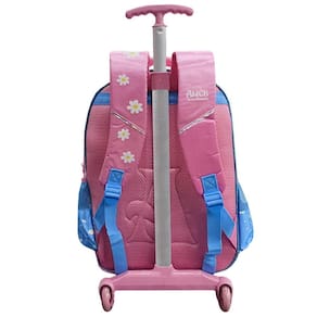 Descrição da mochila: - rodinhas de silicone. - alças acolchoadas e ajustáveis. - alça de mão. - dois bolsos laterais. - zíper duplo personalizado. - compartimento principal com amplo espaço interno para livros, cadernos e materiais escolares. - bolso frontal para organização.