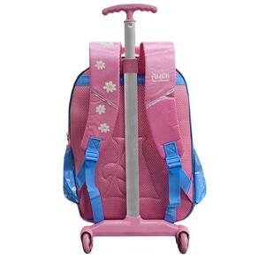 Descrição da mochila: - rodinhas de silicone. - alças acolchoadas e ajustáveis. - alça de mão. - dois bolsos laterais. - zíper duplo personalizado. - compartimento principal com amplo espaço interno para livros, cadernos e materiais escolares. - bolso frontal para organização.