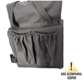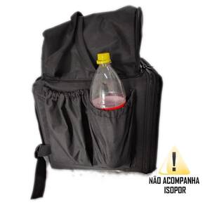 Plástico Frontal para Endereços, Panfletos e logo marca; Alças Ajustáveis com Fecho em abs; Fechamento Através de Zíper de qualidade; Possui Partes Refletivas frontais; Suporta 4 Garrafas de refrigerante nas laterais; Mochilão superior térmico para pizzas e refrigerantes,etc; Caixa de isopor: NÃO ACOMPANHA Fabricada em tecido Nylon 600, de alta resistência.