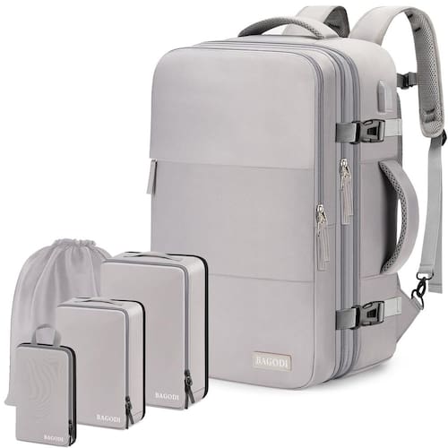 BAGODI Mochila Carry On, Mochila de Viagem Aprovada por Voo 40L para Homens e Mulheres - Mochila de viagem expansível: com uma capacidade expansível que vai de 22 a 42 L, você terá todo o espaço necessário para viagens de 3 a 5 dias ou viagens diárias, dando a você a liberdade de levar tudo o que você precisa com você. E esta mochila de mão atende aos requisitos de tamanho aprovados pela IATA, você pode guardá-la facilmente no compartimento superior ou sob o assento sem qualquer incômodo. Se você estiver viajando pelo mundo ou apenas pela cidade, é a companhia perfeita para sua próxima aventura. - Capacidade e compartimentos espaçosos: esta mochila é perfeita para quem precisa se manter organizado. O compartimento principal é espaçoso o suficiente para guardar todos os seus itens essenciais de viagem. O bolso frontal é projetado com seus pequenos itens em mente, oferecendo amplo armazenamento para o seu telefone e muito mais. Esta mochila para laptop também possui um compartimento dedicado para laptop de 17 polegadas com acolchoamento extra para manter seu computador seguro em movimento. Além disso, há um bolso lateral discreto projetado para guardar uma garrafa de água de 1000 ml. - Mochila à prova d'água e antirroubo: nossas mochilas de viagem masculinas são feitas de material impermeável de alta densidade com bolsas separadoras secas e úmidas no bolso principal para manter suas roupas secas e organizadas. Além disso, o bolso traseiro antifurto é um recurso útil para guardar suas roupas valiosas. Esta mochila de viagem oferece uma maneira conveniente de carregar seu celular com uma porta USB integrada e cabo de carregamento interno. Se você estiver viajando a negócios ou lazer, esta mochila de viagem é uma ótima escolha. - Design prático e confortável: esta mochila de mão é feita para durar com zíperes resistentes e pontos reforçados, garantindo durabilidade para todas as suas viagens. As costas e as alças de ombro são acolchoadas com malha de esponja respirável, aliviando a pressão e melhorando a ventilação para um ajuste confortável. Além disso, as alças ajustáveis no peito garantem o ajuste perfeito para todos os tipos de corpo. A alça de bagagem mantém presa ao seu carrinho, evitando escorregões e garantindo um transporte suave e sem complicações. - Mochila multiuso: é a combinação perfeita de conveniência e versatilidade. Suas duas alças acolchoadas permitem alternar sem esforço entre usá-la como mochila ou mala. É incrivelmente versátil e pode ser usada como uma mochila casual, mochila de viagem como item pessoal aprovado por voo, bolsa de fim de semana ou até mesmo uma bolsa de caminhada. É perfeita para viajantes, entusiastas de atividades ao ar livre e qualquer pessoa que precise de uma mochila confiável e durável para suas viagens.