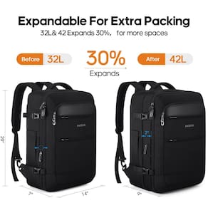 NOTA: Confirme o tamanho da mochila (50,8 x 17,7 x 35,5 cm) antes de comprar. A alça de ombro está oculta, você precisa abrir o zíper para tirá-la. Se você tiver qualquer outro problema de qualidade, e forneceremos um reembolso total ou reenviaremos. - ??Grande capacidade e expansível?Esta mochila para viagem possui expansão de zíper, que pode expandir até 42 L para 3 a 7 dias de itens essenciais de viagem. O espaçoso compartimento principal com alças para proteger suprimentos de viagem, um compartimento separado para laptop de 17 polegadas e um bolso oculto antirroubo na parte traseira protegem seus itens valiosos. É perfeita para viagens, negócios, acampamento ou cruzeiros com um tamanho de 50 x 35 x 17 cm. Verifique o tamanho antes de comprar. - ??Mochila de transporte aprovada por voo?Esta mochila para laptop masculina é projetada para viagens, você pode viajar para qualquer lugar que quiser, e duas alças acolchoadas para facilitar a troca entre mochila e mala. Há uma alça de bagagem na parte de trás, que pode ser colocada na bagagem. Cabe acima da cabeça e sob o assento, em um estado de tamanho de bagagem de mão padrão, e é ideal para homens, mulheres, viajantes de fim de semana ou férias ocasionais. - ??Material mais durável e bloqueio antirroubo?A mochila para viagem é feita de poliéster durável e resistente à água e material antiarranhões. O zíper duplo de metal resistente e a costura reforçada atualizada fazem com que dure mais tempo. Além disso, esta mochila de bagagem tem uma trava antirroubo, então não haverá mais preocupações em perder itens durante viagens, acampamento ou cruzeiros. - ??Alças de ombro ocultas e esponja respirável? O design de malha de esponja respirável na mochila masculina para laptop e as alças acolchoadas ajudam na convecção de ar, ventilação e eliminação de calor, além de ajudar a aliviar o desconforto do seu ombro. Esta mochila de bagagem é feita com alças acolchoadas que podem ser escondidas no painel traseiro com zíper quando não estiver sendo usada. - ??3 cubos de embalagem + 1 bolso para sapatos?Cubo grande para suéteres, jaquetas e calças. Cubo médio para camisas e shorts. Cubo pequeno com um lado transparente para fornecer uma visão geral clara dos produtos de higiene pessoal. Há também um bolso para sapatos. Mantém seus pertences organizados e organizados. A mochila para laptop tem uma porta USB integrada para carregar seu telefone convenientemente conectando seu próprio carregador portátil (não incluindo um carregador USB).