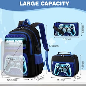 Mochila infantil - ?Combinação perfeita? Ao comprar este conjunto de volta às aulas, você receberá uma mochila, uma lancheira e um estojo de lápis da mesma coleção. Se o seu pequeno vai para a escola primária, ensino médio ou ensino médio, este conjunto de mochila atende a uma variedade de exigências dos estudantes, também é perfeito para viagens, acampamento, caminhada e outras atividades ao ar livre. - ?Grande capacidade?Com seu tamanho de 44 x 31 x 16 cm e 8 bolsos diferentes, esta mochila infantil para meninos tem muito espaço para manter seus pertences organizados. Dois compartimentos principais grandes adequados para livros, estojos de caneta, roupas finas, laptops, etc. E os 3 bolsos frontais oferecem fácil acesso a itens menores, como chaves e cartões de identificação. Dois bolsos laterais guardam garrafas de água e guarda-chuvas. - ?Design ergonômico?A mochila para meninos é projetada com a ergonomia em mente, com alças de ombro ajustáveis e respiráveis e uma fivela no peito para distribuir uniformemente o peso e reduzir a pressão no ombro. A parte traseira acolchoada com ar a torna confortável de usar por longos períodos sem suar. Além disso, as tiras refletivas em nossas alças de ombro tornam mais seguro para as crianças caminharem à noite. - ?Materiais duráveis?A mochila escolar é feita de tecido oxford de alta densidade, o material tratado a torna impermeável, resistente à cor, inodora, fácil de limpar e saudável. Pode proteger todos os itens da mochila de garoa. As alças grossas, alças fortes, zíperes suaves e costuras reforçadas garantem que esta mochila resista ao teste do tempo. - ?Atendimento ao cliente?: Garantimos nossos produtos com uma garantia vitalícia e excelente atendimento ao cliente. Se você encontrar algum problema com sua mochila, não hesite em entrar em contato conosco por e-mail.