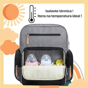 - Bolso lateral com material térmico e bolso com porta lenços umedecidos sem a necessidade de abrir a mochila e bolsos frontais;