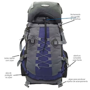 A mochila possui 70 cm de altura x 35 cm de largura x 25 cm de profundidade, com capacidade total de 60 litros.