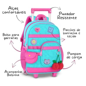 A mochila de carrinho da coleção Juju Teófilo é puro encanto e foi pensada para acompanhar as pequenas com muito estilo, conforto e praticidade na rotina escolar. Confeccionada em poliéster soft com acabamento em matelassê, ela traz patches emborrachados e de tecido que deixam o visual ainda mais delicado e divertido, além de acompanhar um charmoso chaveiro de cerejinhas e uma bolsinha exclusiva que completa o look de forma única. Possui compartimento principal amplo, ideal para organizar materiais escolares, pastas ou até uma troca de roupinhas, além de um compartimento frontal espaçoso com divisórias internas que ajudam a manter tudo no lugar. Na parte frontal, conta ainda com mais um bolso adicional de fácil acesso, perfeito para pequenos objetos, e bolsos telados nas laterais para garrafinhas ou itens de uso rápido. O carrinho com haste retrátil facilita o transporte no dia a dia, garantindo conforto também para crianças menores. As alças permitem o uso nas costas quando necessário, oferecendo versatilidade no uso. Dimensões aproximadas: 40x30x13cm. Marca: Não Informado