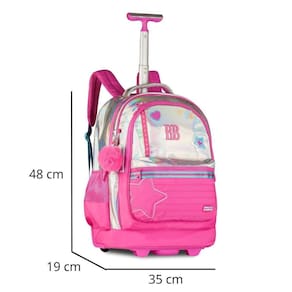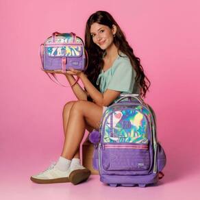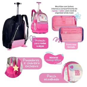 Um modelo exclusivo e cheio de estilo, a mochila de carrinho Rebecca Bonbon RB27016 é confeccionada em PVC holográfico com bordado de estrela, patches no painel frontal, etiqueta emborrachada e cadarços estampados, trazendo um design moderno e único. O compartimento principal é muito espaçoso e conta com divisória acolchoada para notebook e outra para tablet. Além disso, possui dois compartimentos frontais com fechamento por zíper, sendo um deles com divisórias internas, além de bolsos laterais telados duplos. Acompanha chaveiro triplo, incluindo um pompom com orelhinhas super charmoso, além de cartela de adesivos exclusivos da Rebecca Bonbon. Pode ser Utilizado como mochila de carrinho, com rodinhas resistentes, puxador de metal com duas alturas e trava, além de base de apoio frontal. Ou, se preferir, pode ser Utilizado nas costas, já que possui alças acolchoadas ajustáveis que ficam guardadas em compartimento traseiro fechado por zíper, junto com protetor de rodinhas para evitar sujeiras nas roupas. Conta ainda com alça de mão superior. Todos os puxadores de zíper são personalizados. Dimensões aproximadas: 48x35x19cm.