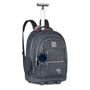 Esse kit da Rebecca Bonbon é completo e cheio de estilo A mochila de rodinhas RB27023, em jeans com detalhes em ouro velho, é super espaçosa, possui compartimento acolchoado para notebook e tablet, além de vários bolsos organizadores e bolsos laterais. Pode ser Utilizado tanto no carrinho, com rodinhas resistentes e puxador de metal, quanto nas costas, com alças acolchoadas escondidas no compartimento traseiro e proteção de rodas. Acompanha chaveiro de pompom com orelhinhas, correntinha com strass e cartela de adesivos. Dimensões: 48x35x19cm. A lancheira RB27025 é térmica, tem ótimo espaço interno, bolsinho frontal, três opções de alça mão, ombro e carona e combina perfeitamente com a mochila. Dimensões: 20x24x14cm. O estojo box RB27026 completa o kit com muito espaço: são 36 elásticos para organizar lápis, um estojo interno fechado por zíper e capacidade para até 100 itens. Dimensões: 22x16x6cm.