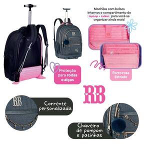 Esse kit da Rebecca Bonbon é completo e cheio de estilo A mochila de rodinhas RB27023, em jeans com detalhes em ouro velho, é super espaçosa, possui compartimento acolchoado para notebook e tablet, além de vários bolsos organizadores e bolsos laterais. Pode ser Utilizado tanto no carrinho, com rodinhas resistentes e puxador de metal, quanto nas costas, com alças acolchoadas escondidas no compartimento traseiro e proteção de rodas. Acompanha chaveiro de pompom com orelhinhas, correntinha com strass e cartela de adesivos. Dimensões: 48x35x19cm. A lancheira RB27025 é térmica, tem ótimo espaço interno, bolsinho frontal, três opções de alça mão, ombro e carona e combina perfeitamente com a mochila. Dimensões: 20x24x14cm. O estojo box RB27026 completa o kit com muito espaço: são 36 elásticos para organizar lápis, um estojo interno fechado por zíper e capacidade para até 100 itens. Dimensões: 22x16x6cm. Marca: Não Informado