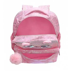 A mochila de costas Pack Me Cute é produzida em Poliéster e PVC Descolada e com material resistente Possui 1 bolso grande com um amplo espaço interno 1 bolso frontal para os demais objetos 2 bolsos laterais pequenos Alças acolchoadas e com regulagem.