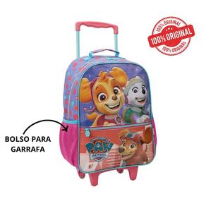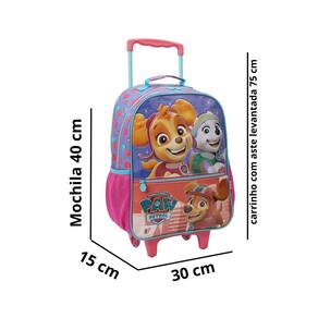 Mochila mala com rodas 16 paw patrol patrulha canina sky xeryus linha de patrulha canina mala com rodinhas para os fãs do desenho em tamanho 16, é produzida em poliéster resistente e estampado. Painel frontal com o chase em material suave e fofinho e destaque para os demais personagens em pvc cristal estampado. Compartimento principal amplo, 2 bolsos laterais em mesh com elástico. Zíper com puxadores personalizados. Carrinho em metal com travas.