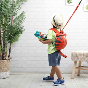 A criança veste a mochila, que tem alças ajustáveis e acolchoadas e conta com uma guia com alça que estende até 1 metro. Disponível em 4 personagens, ela é divertida, para ser usada de forma lúdica e permite que a criança leve pequenos brinquedos.