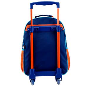 Em tamanho 14 , produzida em poliéster resistente e estampado Painel frontal em PVC vincado - Compartimento principal amplo , 2 bolsos laterais mesh, zíper com puxadores personalizados, alça de mão em nylon com poliester e piping forrado Carrinho em metal com travas