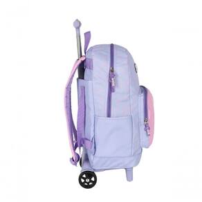 Possui base com duas rodinhas e alças de costas acolchoadas e ajustáveis, permitindo alternar entre o transporte como carrinho ou mochila tradicional. Conta com um compartimento principal amplo e simples, um bolso frontal com zíper e dois bolsos laterais, garantindo organização prática para livros, cadernos, garrafinha de água e acessórios. Seu design se destaca pelo logo atoalhado e estampa bordada, fabricada em poliéster resistente e com zíper personalizado, oferecendo durabilidade e estilo únicos.