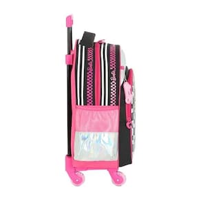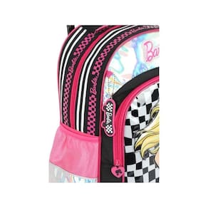 - confeccionada em poliéster e pvc - com amplo espaço interno. - com bolsos laterais para garrafinha. - com 2 bolsos. - com um bolso frontal espaçoso e um frontal médio. - com alça de mão acolchoada. - com puxadores de zíper personalizados. - chaveiro exclusivo barbie skate. - com rodinhas que giram 360 graus.