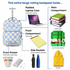 A inovadora e versátil mochila com rodinhas J World Sundance para escolas e viagens possui um compartimento para laptop de 15,6" e um molde de proteção inferior para garantir que seu dispositivo não seja danificado durante a viagem. A mochila para laptop com rodas Sundance pode ser utilizada como bagagem de mão ou como mochila para laptop com tiras que é fácil de transportar. Organize todos os seus pertences com um bolso frontal equipado com porta-lápis, chaveiro e bolso de malha, perfeito para guardar itens que podem ser facilmente acessados. Para quem precisa de hidratação em trânsito, tem bolsos laterais de malha que são ideais para guardar garrafas de água e vários outros recipientes para bebidas. Com enorme capacidade, esta mochila para laptop carrega facilmente um laptop, fichário de 3 polegadas, 3 livros didáticos universitários, cadernos, disco rígido portátil e almoço com espaço de sobra. A alça de alumínio de tubo único se estende até 34 ou 39 polegadas para facilitar a manobrabilidade de crianças e adultos de até 6 pés e 3 polegadas de altura.