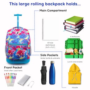 Viaje, volte para a escola ou durma na casa do pijama com estilo, com seus pertences bem guardados na mochila rolante J World Sunrise. A versatilidade da mochila com rodas Sunrise permite que ela funcione tanto como bagagem de mão rolante quanto como mochila com tiras para estudantes. Possui alça telescópica de alumínio leve, rodas macias e silenciosas e molde de proteção inferior para maior durabilidade. Organize todos os seus pertences com um bolso frontal equipado com porta-lápis, chaveiro e bolso de malha, perfeito para guardar itens que podem ser facilmente acessados. Para quem precisa de hidratação em trânsito, tem bolsos laterais de malha que são ideais para guardar garrafas de água e vários outros recipientes para bebidas.