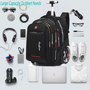 O tamanho da mochila grande com rodinhas é de 51 x 35 x 33 cm. O compartimento acolchoado para laptop pode acomodar um laptop de 15,6 polegadas. O compartimento principal espaçoso tem uma capacidade de 55 L e pode acomodar muitos livros, arquivos de escritório. Uma mochila de rodinhas pode conter vários livros, arquivos, computadores, chaves, iPads e alguns dispositivos com espaço livre dentro - ? Capacidade de 55 L ? O tamanho da mochila grande com rodinhas é de 50,8 x 35,5 x 33 cm. O compartimento acolchoado para laptop pode acomodar um laptop de 15,6 polegadas. O compartimento principal espaçoso tem uma capacidade de 55 L e pode acomodar muitos livros, arquivos de escritório. Uma mochila de rodinhas pode conter vários livros, arquivos, computadores, chaves, iPads e alguns dispositivos com espaço livre dentro - ?Fácil de dominar com rodas de 17 polegadas?A mochila tem rodas de 18 cm mais largas, que são estáveis, economizam energia e eficientes. Pode passar facilmente por vários canais e escadas. As rodas são grandes, facilitando a compreensão da direção. As rodas são altas para evitar o desgaste da mochila - ?A mochila com rodas tem alças?A mochila com alças reforçadas e atualizadas, o que a torna muito resistente e capaz de suportar o peso dos adultos em pé. Adota um design suave, permitindo que as alças abram e fechem livremente por um longo tempo - ?Design de cinto de segurança de nylon impermeável e reflexivo?O tecido impermeável permite que você viaje entre cidades sem se preocupar com dias chuvosos. Protege melhor seu laptop e arquivos, tornando-o adequado para negócios e turismo; o design do cinto de segurança refletivo pode manter a segurança à noite - ?Alças de ombro ocultas e compartimento para casa do rodas?Nossa mochila com rodas está equipada com alças de ombro ajustáveis e alças de absorção de choque. É muito confortável e fácil para homens e mulheres dirigirem. Também é usada como uma mochila de viagem portátil e vem com uma capa de roda para manter suas costas limpas. As alças de ombro e a capa das rodas podem ser escondidas para facilitar o movimento entre as cidades