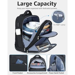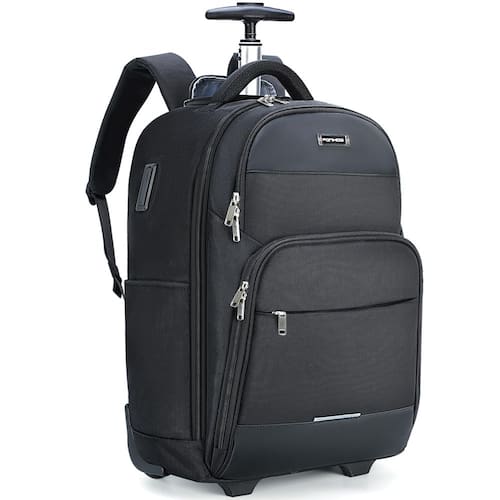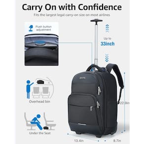 Mochila executiva premium de grande capacidade para laptop – sua melhor companheira de viagem Descrição do produto: Melhore sua experiência de viagem de negócios com nossa mochila de negócios premium para laptop com rodinhas de grande capacidade. Projetada para o profissional moderno em movimento, esta mochila combina estilo, funcionalidade e durabilidade para atender a todas as suas necessidades de viagem. Opções de transporte versáteis: Alterne perfeitamente entre uma mochila e uma mala com rodinhas com nosso design inovador de transporte duplo. As alças de ombro acolchoadas e ajustáveis e a alça ergonômica garantem conforto e facilidade, esteja você navegando pelos terminais do aeroporto ou pelas ruas movimentadas da cidade. Organização espaçosa: Nossa mochila de viagem possui um compartimento principal generoso que pode acomodar um laptop de até 17 polegadas, com bolsos adicionais para tablets, documentos e outros itens essenciais. A seção organizadora frontal é perfeita para acesso rápido ao seu telefone, chaves e documentos de viagem. Compartimento dedicado para laptop: Proteja seus valiosos dispositivos com um compartimento acolchoado dedicado para laptop que garante segurança durante suas viagens. Características adicionais: Cor: preta Tamanho: 17,32 x 11,81 x 9,05 polegadas / 44 x 30 x 23 cm Material: nylon de sarja 900D com material de alta densidade revestido Vários compartimentos para armazenamento organizado Bolsos laterais para garrafas de água ou guarda-chuvas Detalhes reflexivos para visibilidade durante o início da manhã ou tarde da noite. Seja você um executivo viajante do mundo ou um viajante ocupado, nossa mochila para laptop de grande capacidade é a mistura perfeita de sofisticação e praticidade, tornando-a sua escolha ideal para todas as suas aventuras de viagem. Junte-se a milhares de clientes satisfeitos e atualize seu equipamento de viagem hoje! - Grande capacidade de 30L: esta mochila com rodinhas mede 58 x 34 x 22 cm e inclui uma capa acolchoada para laptops de até 15,6 polegadas, perfeita para viagens de negócios. Outras características incluem um bolso rápido para o seu passaporte, um organizador frontal e bolsos laterais para garrafas. Uma mochila com rodinhas bem projetada permite que você acesse seus pertences facilmente - RODAS DE ROLO SILENCIADAS: o design da roda inserida da mala de 2 rodas reduz de forma ideal a pegada geral. Oferece mais espaço de armazenamento do que um modelo de 4 rodas da mesma altura. Além disso, devido à trajetória fixa das rodas, elas são menos propensas a danos e proporcionam melhor estabilidade em superfícies irregulares - Material protetor: a mochila de viagem com rodinhas é feita de tecido de poliéster 1680D resistente. Mochila de trabalho de negócios equipada com um protetor de canto e pés de suporte para proteger a mochila contra abrasão. O design traseiro acolchoado respirável pode aliviar a pressão nas costas, deixando você mais confortável - Fácil de transportar: a alça telescópica e de bloqueio escondida armazena facilmente sob a capa superior com zíper, garantindo um toque macio e aderência confortável. As alças de ombro podem ser guardadas no painel traseiro quando não estiver em uso, oferecendo outra opção de transporte como mochila com rodinhas - Porta de carregamento USB: mochila de rolo de negócios com design de cabo de carregador USB embutido, que oferece uma maneira mais conveniente de carregar seu telefone conectando seu carregador portátil e cabo. Mochilas de rodinhas para adultos com rodas podem ser colocadas sob o assento do metrô, adequadas para uma viagem de fim de semana
