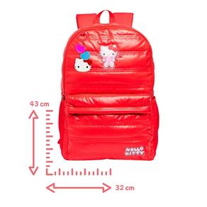 Características: - Confeccionada em Puffer - Alça de mão - Alças acolchoadas e ajustáveis - Dois bolsos laterais em mesh - Puxadores de zíper personalizados - Chaveiro Hello Kitty - Forro personalizado