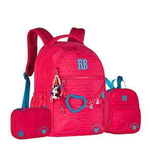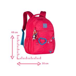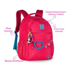 Características Mochila: - Alça de mão - Alça de costas - Alça carona - Bolso antifurto - Bolsos Laterais - Confeccionados em material soft com Matelassê localizado com corações - Chaveiros de miçangas, mascote 3D - Corrente com coração emborrachado e pingentes - Logo RB em metal colorido - Zíper tratorado com puxadores com cadarço - Compartimentos para laptop + tablet- Forro rossa listrado