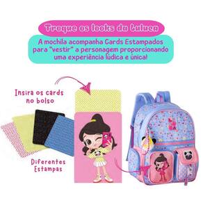 - Cards estampados para vestir a personagem no bolso frontal, oferecendo uma experiência lúdica e divertida para as pequenas.