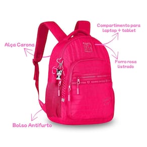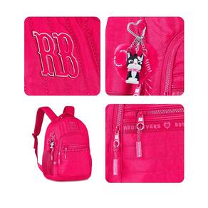 Características Mochila: - Alça de mão - Alça de costas - Alça carona - Bolso antifurto - Bolsos Laterais - Confeccionados em material soft com Matelassê localizado com corações - Chaveiros pompom de coração, cadarço, medalhinha de metal e mascote 3D - Logo RB em metal colorido - Zíper tratorado com puxadores com cadarço - Compartimentos para laptop + tablet- Forro rossa listrado