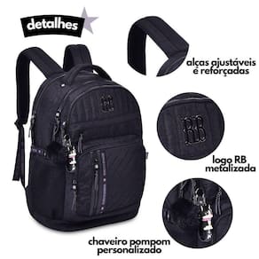 Detalhes: Chaveiro de pompom e borracha com Rebecca Bonbon 3D; A mochila é resistente, durável e reforçada; 2 bolsos laterais telados; 5 bolsos externos; Um espaço interno para Notebook;