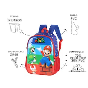 Mochila Costas Super Mario Bros Infantil Escolar Meninos - Luxcel Apresentamos a incrível Mochila de Costas Super Mario, perfeita para as aventuras escolares do seu filho Com um design divertido que traz a icônica presença do Super Mario, não é apenas estilosa, mas também super funcional. A mochila de Costas facilita o transporte, ideal para meninos em idade escolar. Com estampa vibrante dos personagens, alças ajustáveis e amplo espaço interno, é perfeita para o dia a dia na escola com estilo e diversão. Características Mochila: Alça de mão Alça de costas Bolsos laterais Identificador personalizado Puxadores em Zíper Especificações Mochila: Marca: Super Mario Medidas Aproximadas Mochila A x L x P : 41cm x 30cm x 14cm Peso: 500g Aprox Capacidade: 17L Composição do produto: Poliéster e PVC Conteúdo da Embalagem: IS41381MO - 1 Mochila Costas Super Mario As cores podem variar entre as imagens mostradas acima e o produto. Imagens meramente ilustrativas. Todas as informações divulgadas são de responsabilidade exclusiva do fabricante. de 90 dias contra defeito de fabricação. Marca: Não Informado
