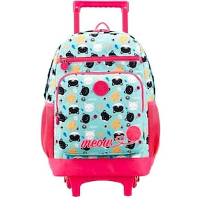 A mochila com Rodas College Gato da Xeryus possui o tamanho de 16'', sendo produzida em poliéster resistente e com estampa de gatinhos Meow. Possui 2 bolsos frontais, 2 bolsos laterais e compartimento principal amplo. Conta também com abas para proteger os zíperes com puxadores personalizados. O Carrinho resistente com haste em alumínio e regulagem de altura.