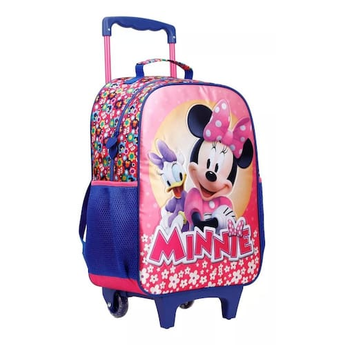 A Mochila Rodinhas Minnie Jogo Alto-relevo é de tamanho 16", fabricada em poliéster resistente e estampada. Possui painel frontal com estampa da Minnie, compartimento principal amplo, 2 bolsos laterais de mesh com poliéster e elástico. O zíper tem puxadores personalizados. A alça de mão é de poliéster com mesh. O carrinho é de metal com travas.